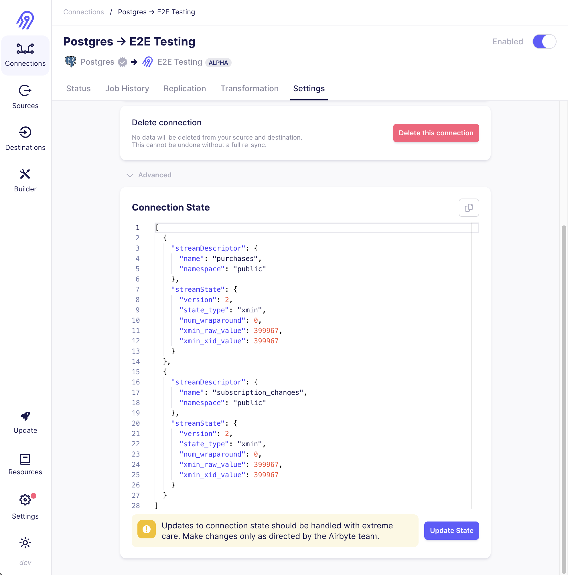 1. Go to your newly created connection, replace the state with the copied contents in the previous step, then click Update State. This will ensure historical data is not replicated again.